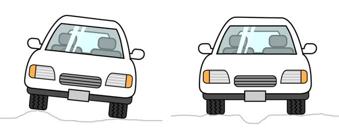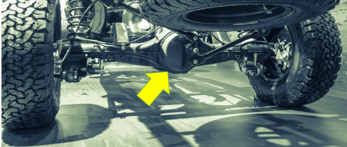 「デフ」は「ディファレンシャルギア」の略称で、これは(詳しい原理は省略しますが)自動車がスムーズに曲がるために左右の車輪の回転を調整するための”歯車を組み合わせた装置”で、その全体をくるむケースが特に”前エンジン・後輪駆動車”や”4輪駆動車”では車体の下側に出っ張ったカタチで左右両輪の中間に見えやすい。(下写真参照)