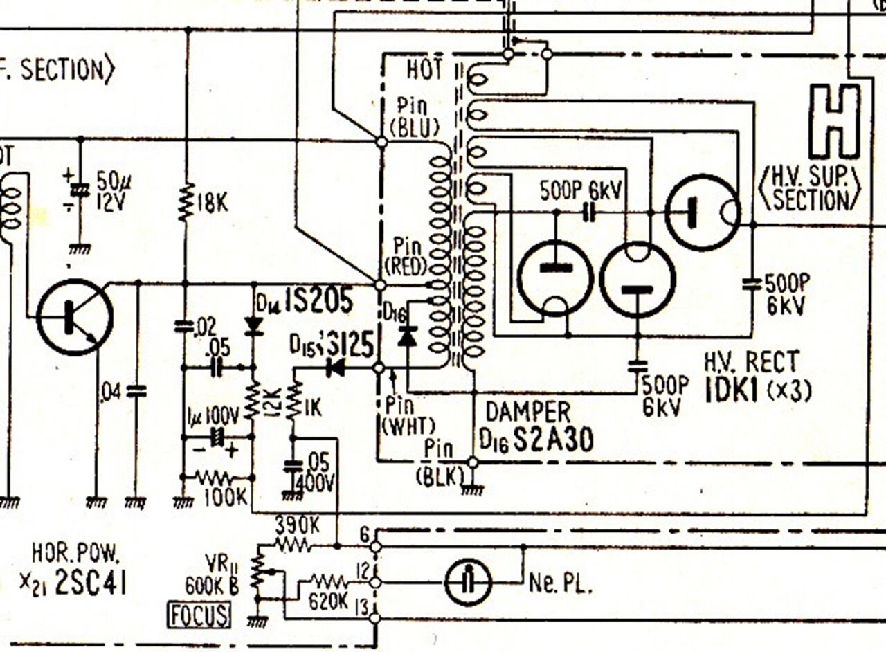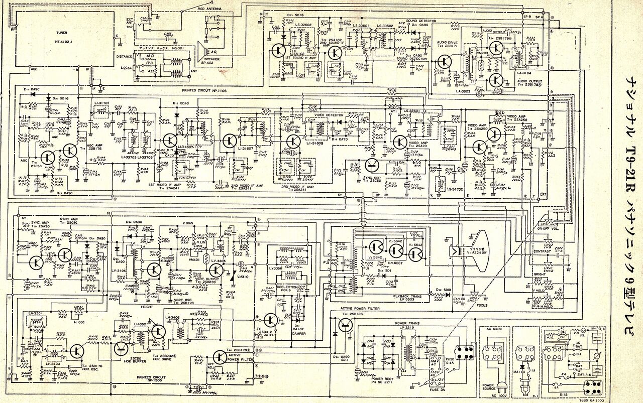 「トランジスタテレビ」と称していたが、初期には日米のメーカーは例外なく真空管も混ぜて使っていて、今風に言えば「ハイブリッド」だった。ブラウン管も真空管の一種であるがこれは別として、当時はテレビ内部の”高圧電流の整流”用には2本または3本の真空管を使わざるをえなかった。(この稿の最後部に掲載の回路図参照ください) 後年、大電力用半導体の開発や回路設計の改良などで真空管は使われなくなりました。
