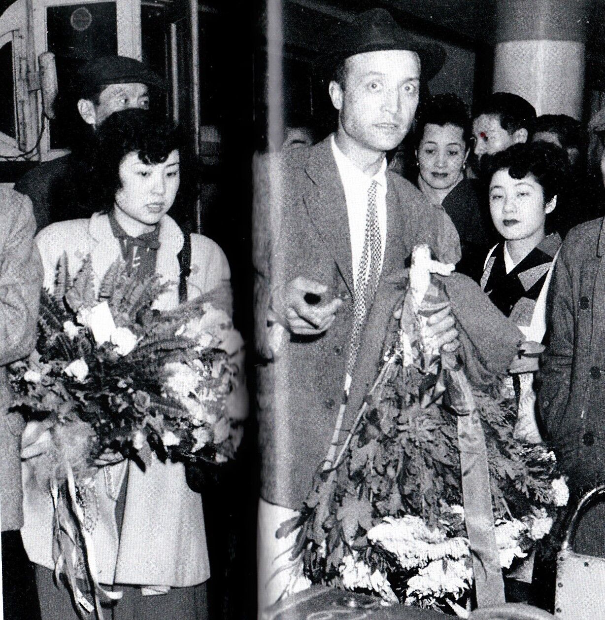 空港で二人を待ち構えていた人たちと報道陣は肩透かしをくらって、用意していた花束を半分はイサム・ノグチに、残り半分は”姉を迎えるべく来ていた李香蘭の妹:山口勢子さん”に渡された。その時の写真↓で中央はノグチで左が勢子さん。