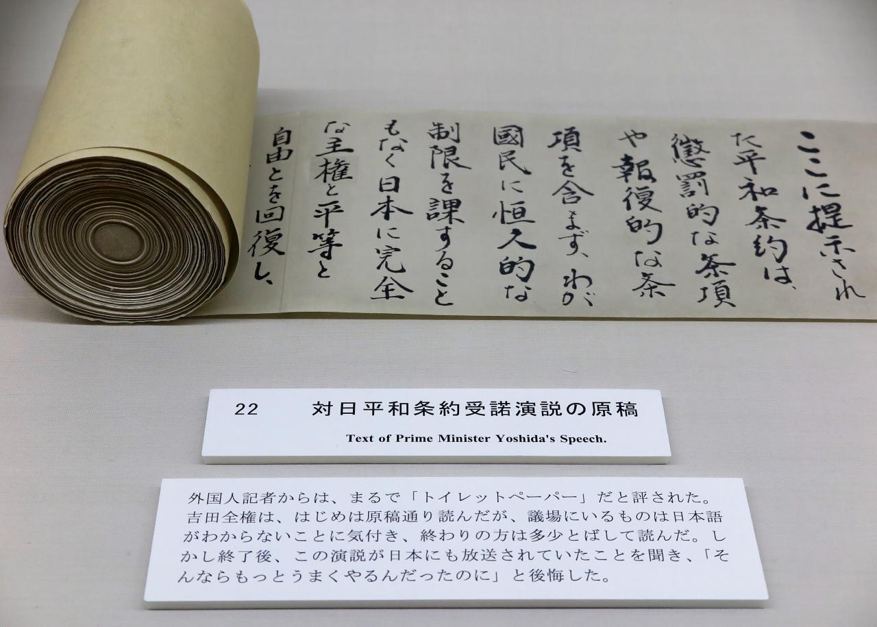 1951年9月8日、日本が連合国側と結んだ「サンフランシスコ平和条約」により独立国としての主権を回復したが、その際の吉田首相が読み上げた平和条約受諾演説文は大きな巻物だったので、海外のマスコミからは”トイレットペーパー”と言われたが、その演説文章を巻物にする提案をして、しかも書いたのは白洲次郎だった。